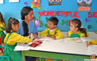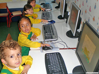 Aula interactiva donde niños y niñas hacen uso de la tecnología como un medio de aprendizaje divertido y atractivo.