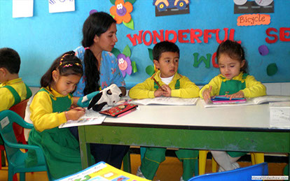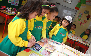 Aula interactiva donde niños y niñas hacen uso de la tecnología como un medio de aprendizaje divertido y atractivo.